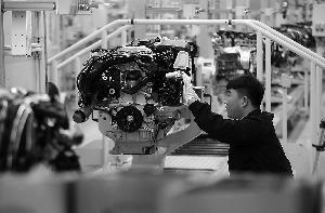昨天,工人在现代化的流水线上生产组装汽车发动机。 本报记者 贾同军摄
