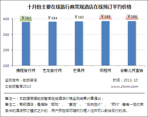 图二:五家主要在线旅游网站在线酒店预订均价(2013年10月监测)