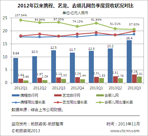近几个季度的财务数据显示,去哪儿网的总体营收增速总体呈下滑态势,增速减缓势将拖慢其逼近携程、艺龙的脚步。