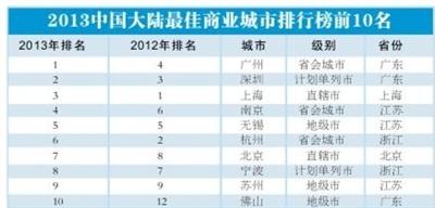 今年是福布斯中文版连续第10年推出“中国最佳商业城市排行榜”。 在今年的榜单上,广州、深圳、上海分列前三位。今年广州强势回归,与其经营成本排名的相对降低,保持在货运、客运方面的绝对优势有直接关联。深圳的排名上升一位,主要原因是加强了对高端人才的培养与引进。上海排名从第一位降至第三位,主要受客货运能力及私营经济活力排名下滑所致。