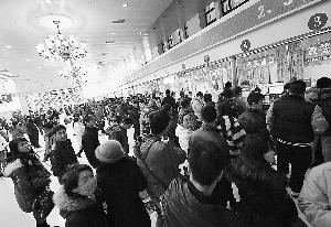 昨天,北京站售票厅内,乘客们排队购票,秩序井然。当日,春运首日(2014年1月16日)临客车票开始发售。2014年春运从当年1月16日开始至2月24日,共计40天。本报记者 和冠欣摄