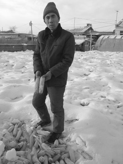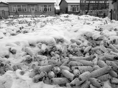 在黑龙江省兰西县红光乡林泉村村民姜希国家100多平方米的院子里,堆着半米多厚的玉米,玉米堆中挖出10多个洞,还可以看到冒出的“气”。姜希国用脚踢开被雪覆盖的玉米,抓起两个玉米穗对《经济参考报》记者说道,“你看,这都是生霉的黑点,棒穗尖的玉米粒都已经霉变了。”姜希国今年种了70多亩玉米,收下的10万多斤玉米都堆在自家院子里。