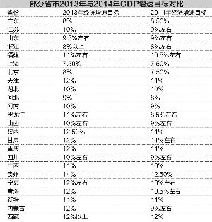 西部各地区给今年定下的经济增速目标也均有下调,但普遍将经济增速保持在两位数。陕西将2014年的经济增速目标由2013年的12.5%下调至11%;贵州将2014年的经济增速目标由2013年的14%下调至12.5%;值得一提的是,在已公布今年经济增速目标的地区中,下调幅度最大的是内蒙古,由2013年的12%下调到2014的9%。
