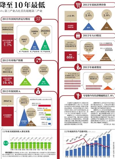 新京报讯 (记者李蕾)2013年GDP同比增7.7%,增速与上年持平,为14年最低。国家统计局1月20日发布数据显示,初步核算,全年国内生产总值(GDP)568845亿元,按可比价格计算,比上年增长7.7%。