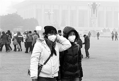 1月15日晚22时,北京市空气重污染应急指挥部发布了今年第一个空气重污染蓝色预警。上图为游客行走在雾霾笼罩下的北京天安门广场。 新华社 王跃岭摄
