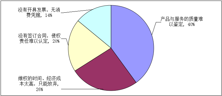 对于美容消费维权难的原因,40%的参与调查者认为是美容服务质量难以鉴定;26%的参与调查者认为维权时间、经济成本太高;认为没有签合同,责任难认定的参与调查者占20%;认为没有开发票,无消费凭据的占14%。