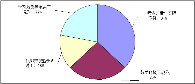 伴随着教育培训市场的发展壮大,一些侵犯消费者合法权益的现象也不断出现。本次调查显示,有37%的参与调查者认为教育机构宣称的师资力量与实际不符,存在浮夸、欺诈的现象;有26%的参与调查者认为教学环境不规范;22%的参与调查者认为教育机构承诺的学习效果没有兑现;有15%的参与调查者表示教育机构不遵守授课时间。