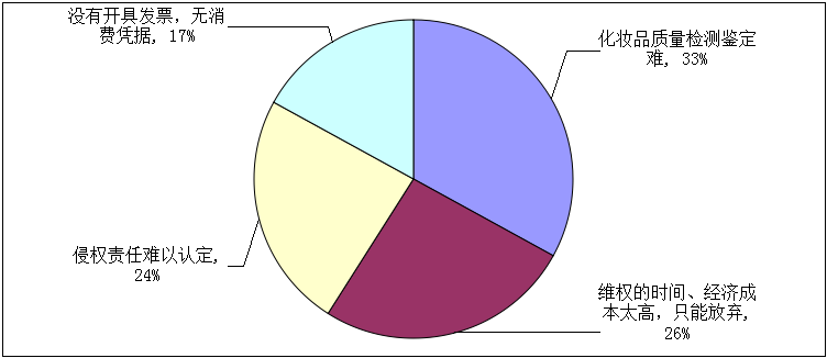化妆品质量检测鉴定难是反映最突出的问题,占比33%;26%的参与调查者认为,维权的时间、经济成本太高,使他们不得不放弃维权;24%的参与调查者认为,侵权责任难以认定;认为没有开发票等缺少维权证据的参与调查者占17%。
