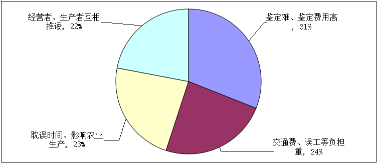 农民遭遇假劣农资问题后,维权并不容易。鉴定难是反映最多的问题,超过四成的参与调查者认为,遇到假劣农资鉴定难。鉴定难也带来了维权成本高这一问题,31%的参与调查者认为,鉴定难、鉴定费用高是农资问题维权成本高的原因,造成农资问题维权成本高的其他三个原因依次是:交通费、误工等负担重;耽误时间,影响农业生产;经营者、生产者互相推诿,占比分别为24%、23%和22%。