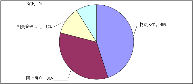 参与调查者在投收快递时,遇到侵权情况,由于投诉渠道不畅通,往往最先还是找物流公司来解决,其占比为45%;34%的参与调查者会找网上商户寻求解决办法,找消协或相关管理部门的分别占比为12%、9%。