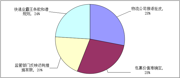 79%的参与调查者认为,消费者遭遇侵权,物流快递行业赔付标准不尽合理。参与调查者在维权过程中常常遭遇物流公司推诿扯皮的比例达到28%,在解决时间上,49%参与调查者表示要超过一周的时间。