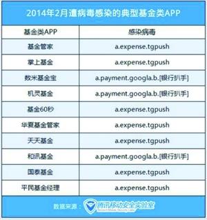 除了可恶的垃圾短信和诈骗短信外,在包含“股票”、“基金”、“理财”、“投资”、“保险”的关键词中,大量此类APP也遭遇病毒感染。据报告显示,2014年2月,腾讯移动安全实验室检测出的Android病毒包为40462个,其中资费消耗类占比53.68%、恶意扣费占比25.45%,恶意扣费类病毒占比较此前月份大幅增加。