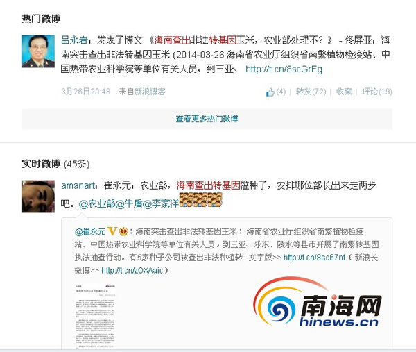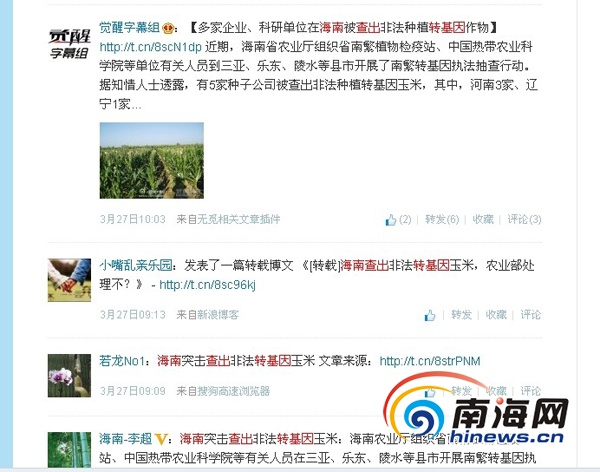 上周,微博上传出多家企业和科研单位在海南被查出非法种植转基因作物的消息。3月31日,海南省农业厅回应传闻称,去年年底海南省农业厅在开展农业转基因作物执法检查工作中,确实查出并依法销毁了9个玉米、棉花转基因试验作物,还有6个涉嫌样品正在进一步检验检测核实中。