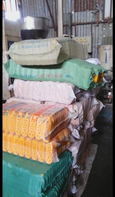 仓库内,一袋袋装有插座外壳面板的编织袋,从洒落的物品可以看出,里面是万能孔插座面板。