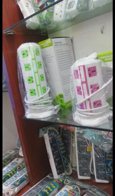 4月3日,在北京市丰台区和义五金城内,记者随意走进一家商铺,店铺内摆放着几十种不同规格和品牌的新、老国标插座,其中有多款标称“驰伟”、“中联”、“皇马”、“泰力”等品牌的万能孔老国标插座。