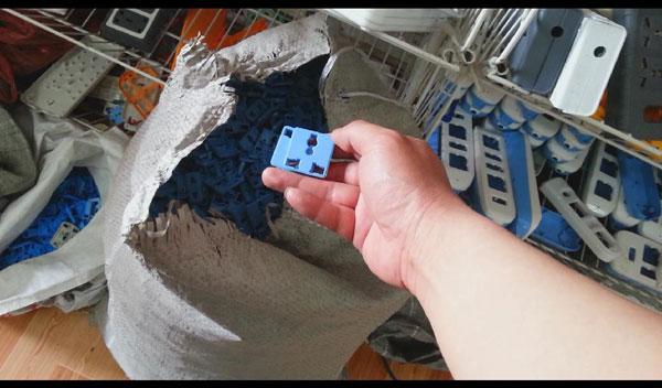 编织袋中是刚刚生产出来的万能孔插座面板。