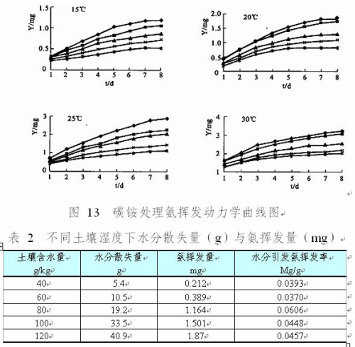笔者实验在低温高效热泵型蒸馏装置中进行,对土壤中提取的水在43℃进行真空蒸馏。疾控中心对蒸馏水成份进行鉴定发现,蒸馏水消除原水中矿物质和重金属等物质,而氨氮等富营养物含量较高。这为前面论述提供有力支撑。研究表明,土壤含水量80克/千克,土壤水分散失引起氨挥发量最高 ,如表2所示。图13显示碳铵处理氨挥发动力学曲线。