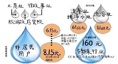 在5月1日与居民水价同时调整的,还有非居民水价和特殊行业水价。非居民水价每立方米上调2元。同时,大幅度提高洗车、洗浴等特殊行业用水价格,每立方米为160元。其中,非居民水价由现行平均价格水平每立方米6.15元统一调整到8.15元,分两步实施。自2014年5月1日起,水价统一调整为每立方米7.15元;自2015年1月1日起,水价统一调整为每立方米8.15元。