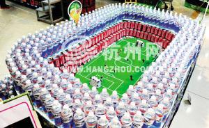 昨天下班去超市买东西,市民张先生很意外地邂逅了一个世界杯球场:超市饮料区外的通道上,数百瓶饮料搭成了一个一米多长的环形足球场,场地内不仅有人偶、足球,还有一台iPad正在播放往年世界杯的精彩赛事。“球迷”张先生忍不住凑到跟前看起了球赛,临走时也不忘“友情赞助”,拿走了一瓶球场边的新品饮料。