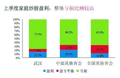 武汉家庭一季度股票市场参与率较上年微幅提升,为 10.8%。中部其他省会仅有6.7%,全国其他省会也只有7.9%,武汉家庭炒股热情有增无减,但亏损现象仍很严重。