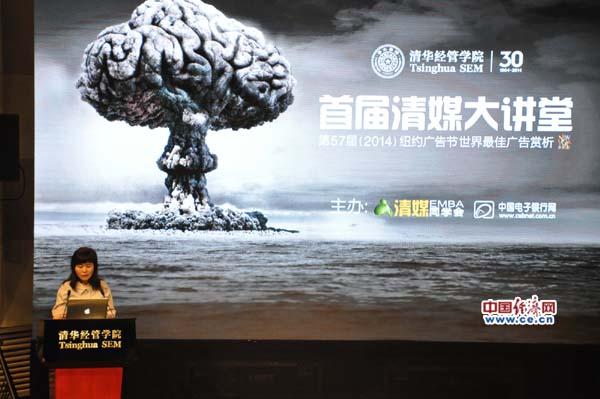 中国经济网北京5月26日讯 由中国电子银行网、清华EMBA媒体同学会联合主办的“首届清媒大讲堂——第57届(2014)纽约广告节世界最佳广告赏析”于5月24日在清华大学举行,中国金融认证中心总经理、中国电子银行网CEO季小杰女士出席并致辞。