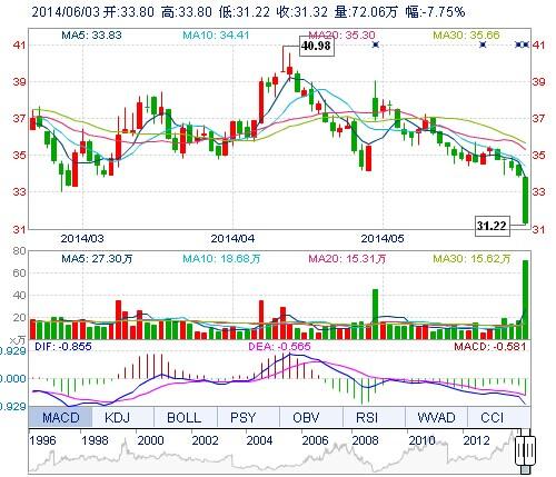 受到利空消息影响,伊利股份表现低迷,截止6月3日,伊利股份报31.32元,跌7.75%。股价创近10个月新低。数据显示,伊利股份总股本20.4亿股,今天每股下跌2.63元,以此计算,伊利股份市值蒸发53.65亿元。