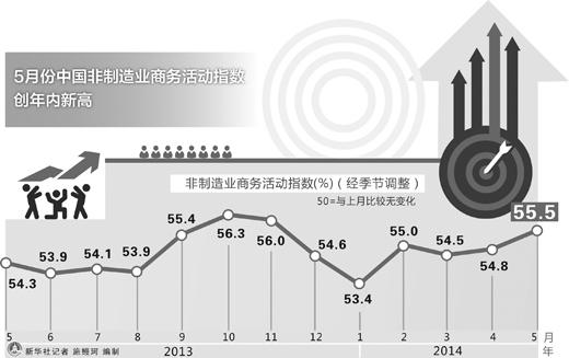5月份,中国非制造业商务活动指数55.5%,环比回升0.7个百分点,创出年内新高。