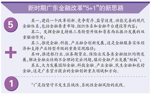 广东省金融办主任刘文通介绍称,2012年,国务院批准了广东省建设珠江三角洲金融改革创新综合试验区,这是中国内地目前为止金融改革创新内容最为丰富的金改试验区。广东已找准金融“大而不强”的关键问题,形成了新时期广东金融改革“5+1”的新思路。