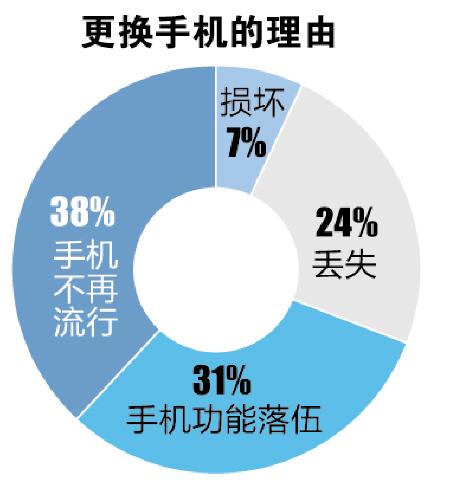 调查数据显示,高达50%的用户平均每18个月更换一部手机。有超过两成的用户,平均在1年内更换手机。值得留意的是,更换手机的理由中,损坏和丢失这两个不可抗拒因素仅占7%和24%,相比之下,31%用户的理由是手机功能落伍,高达38%的用户会因为手机不再流行了而选择更换。对此,报告解读为,手机用户的换机原因中,主观感性需求更高。