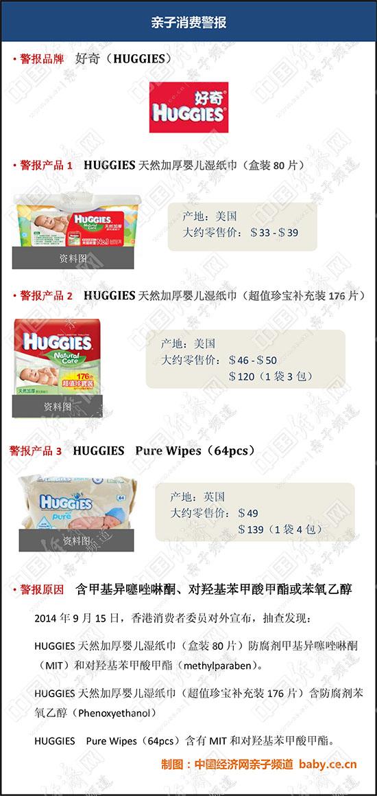 香港消委会抽查发现,产地在英国的“HUGGIES Pure Wipes(64pcs)”婴儿湿巾含有防腐剂甲基异噻唑啉酮(MIT)和对羟基苯甲酸甲酯(methylparaben)。使用旧配方的美国产“HUGGIES天然加厚婴儿湿纸巾”(盒装80片)也含有MIT和对羟基苯甲酸甲酯。另一款使用新配方的美国产“HUGGIES天然加厚婴儿湿纸巾”(超值珍宝补充装176片)不含上述两种成分,但添加了另一种防腐剂苯氧乙醇(Phenoxyethanol)。