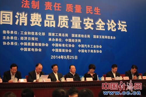 全国质量月的重要活动之一的“中国消费品质量安全论坛”25日在北京召开。论坛由工业和信息化部、国家工商行政管理总局、国家质量监督检验检疫总局、国家互联网信息办公室等部委指导,由经济日报社主办,中国经济网承办。图为首届中国消费品质量安全论坛主席台。中国经济网 裴小阁 摄