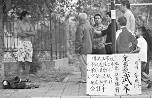 8月2日,马连华的免费武术班开张了。晚上7点,马连华在小区12号楼前的空地上竖起“免费教武术”的牌子,牌子上还注明“练武三不做:1.不做违法之事;2.不欺负弱小;3.不做流氓地痞和黑社会打手。”“其实就是想威慑小区里的黑保安和流氓地痞。”
