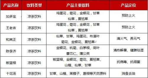 据不完全统计,目前市场上的植物保健饮料五花八门,均定位为保健功能,主要原料也是大同小异,比较知名的有加多宝、王老吉、和其正、陈李济等。