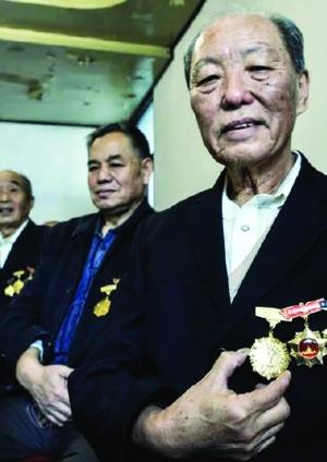 董殿举和其他功臣们佩戴勋章,庆祝原子弹爆炸50周年