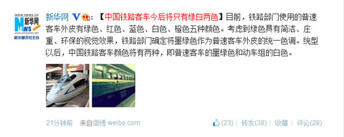 新华社对外部微博“中国独家报道”今日下午发文称,“记者从中国铁路总公司了解到,为推进铁路机车车辆的标准化、简统化,铁路部门从2013年开始逐步开展了普速客车的统型工作。统型以后,中国铁路客车颜色将有两种,即普速客车的墨绿色和动车组的白色。”