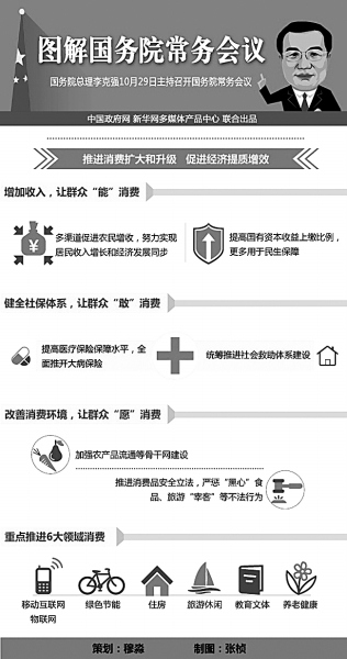 国务院总理李克强10月29日主持召开国务院常务会议。会议指出,消费是经济增长重要“引擎”,是我国发展巨大潜力所在。在稳增长的动力中,消费需求规模最大、和民生关系最直接。