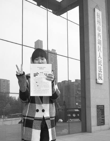 左手举着判决书,右手比着“V”,黄蓉(化名)在浙江省杭州市西湖区人民法院门口,拍下了拿到判决的这一刻。