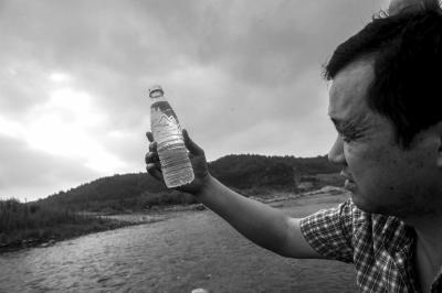 张学理从湖河中提取了一瓶水,他说眼观很清澈无异样,水质很好,但还要带回去进行检测。朱嘉磊摄