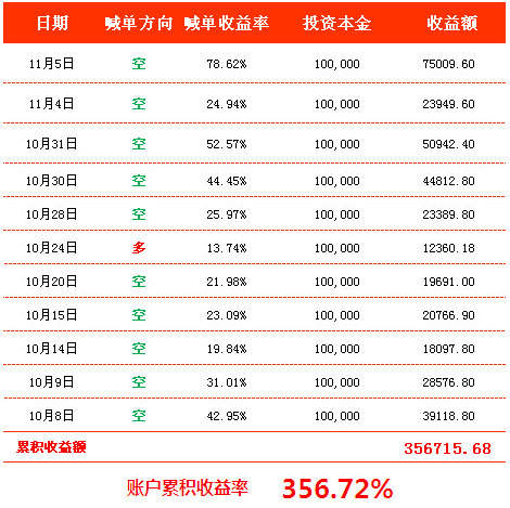 笔者通过盈海贵金属联系到该活动的一位参与客户,他开心的向笔者说道:“自己比较幸运刚加入进去就遇到10月29日的单边下跌行情,并参与了盈海<财富增值5倍计划>活动,在分析师的指导下,仅用一周时间就顺利的实现了账户资产翻倍。”喜悦之情溢于言表,当然在高额的收益面前承担着较大的风险和挑战,如果做错了方向也会遭遇较大损失。