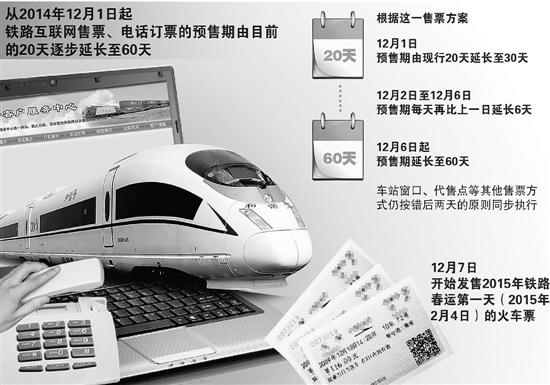 铁路官方消息,自2014年12月1日起,将用一周的时间,逐步将铁路互联网售票、电话订票的预售期,由目前的20天延长至60天。
