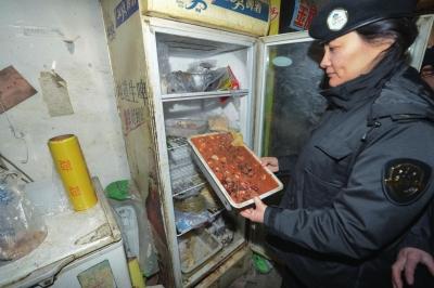 当天上午11时许,记者在将台乡洼子村的一个平房内找到了这个“黑盒饭”窝点,房内约有20多平方米,一名中年男子负责炒菜,一名老汉洗菜,一怀孕女子负责接电话,并分装已经做好的盒饭。屋内的设施基本都是由木板简单搭成,锅灶靠近的墙上一层黑色油污,锅灶上方的抽油烟机上除了油污,还粘着厚厚的灰尘。另外,不管是盛生菜或熟菜的塑料筐和铁盒,周边都布满了黑色油污甚至部分菜盆直接放在已经洗好的菜上摞着,地面上也到处是烂菜叶和湿泥;还有一些用大塑料桶盛放的油、醋等调料都没有遮盖,冰箱内,生肉、生菜和半熟的肉也都混放在一起。