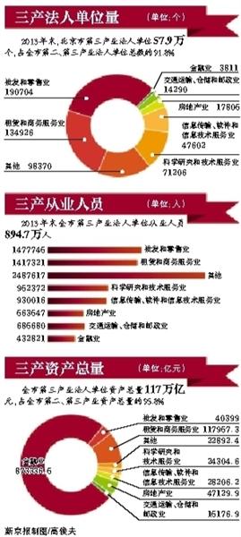此外,数据显示,北京服务业资产总量持续壮大。2013年,全市第三产业法人单位资产总量117万亿元,占全市第二、第三产业资产总量的95.8%,比二经普增长88.1%。其中,88.7%的资产规模集中在金融业、租赁和商务服务业、房地产业3个行业。