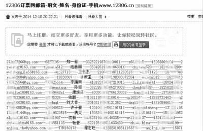 记者从相关网站了解到,泄露数据信息的文件标题为《12306邮箱-密码-姓名-身份证-手机(售后群:31109xxxx).txt》,共计131653条记录、文件约14M。