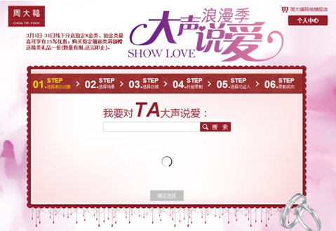 周大福在珠宝首饰领域享有很高的知名度,然而,随着行业竞争激烈程度的加剧,在开拓市场方面做的工作日益关键。周大福在情人节让人们大声说爱,属于典型的借势营销,在天下秀的策划下,微博、微信中实现了近2亿的用户覆盖及800多万次的曝光量,为周大福O2O的实现,流量向销量的转换,知名度的提升等方面,做了一次很成功的营销。
