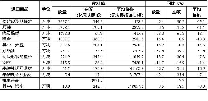此外,进口粮食1007.7万吨,增加16.4%;其中大豆687.6万吨,增加16.2%,进口均价为每吨2969元,下跌14.5%。机电产品进口3971.9亿元,下降3.7%;其中汽车10万辆,减少9.5%(表3)。