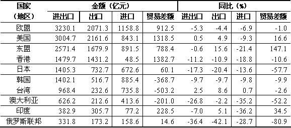 1月,东盟为我国第三大贸易伙伴,与东盟双边贸易总值为2571.4亿元,下降0.6%,占我外贸总值的12.3%。其中,我对东盟出口1679.9亿元,增长15.6%;自东盟进口891.5亿元,下降21.4%;对东盟贸易顺差788.4亿元,扩大1.5倍。日本为我国第五大贸易伙伴,中日双边贸易总值为1405.3亿元,下降17.3%,占我外贸总值的6.7%。其中,对日本出口732.7亿元,下降20.4%;自日本进口672.6亿元,下降13.6%;对日贸易顺差60.1亿元,收窄57.7%。