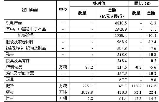 五、机电产品和传统劳动密集型产品出口均有所下降。1月,我国机电产品出口6810.5亿元,下降1.3%,占出口总值的55.5%。其中,电器及电子产品出口2846.9亿元,增长3.3%;机械设备1935.4亿元,下降10.1%。同期,服装出口968.6亿元,下降12.4%;纺织品594.8亿元,下降7.6%;鞋类348.8亿元,下降10.8%;家具348.4亿元,增长0.7%;塑料制品214.6亿元,下降5.6%;箱包157.9亿元,下降10.2%;玩具67.7亿元,增长9.6%;上述7大类劳动密集型产品合计出口2700.8亿元,下降8.4%,占出口总值的22%。此外,肥料出口276万吨,增加1.1倍;钢材1028.8万吨,增加52.1%;汽车7.2万辆,减少17.3%(表2)。