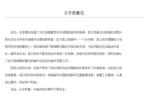人民网北京3月2日电 (刘然)今天,北京燕文物流有限公司针对“地摊摆卖国际邮件”事件,在其官方网站发布《公开致歉信》,信中表示,确认报道中出现的邮件为该公司邮件,并“因我公司的失误,给用户带来了损失同时也给中国邮政形象带来了负面影响”深表歉意。