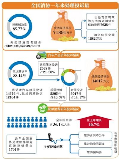 中国消费者协会副会长兼秘书长常宇介绍,从去年3月15日起截止到今年3月1日,全国消协组织共受理消费者投诉580214件,解决497638件,投诉解决率85.77%,为消费者挽回经济损失71891万元。其中,因经营者有欺诈行为得到加倍赔偿的投诉7628件,加倍赔偿金额1582万元。