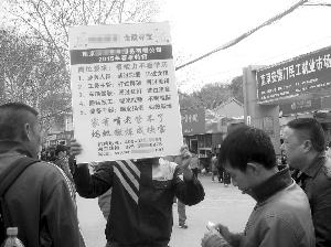 现代快报记者了解到,这是一家搬家公司的招聘广告,昨天上午,两名男子各举着一块黄底蓝字的牌子,在安德门民工市场外来回走,吸引了不少人的目光。记者看到,招聘广告的岗位要求:1业务人员:谈过恋爱、追过女孩;2工务主管:打过群架、背过黑锅;3车辆驾驶:闯过红灯、逃过违章……
